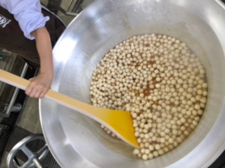 下段の写真は、みたらしのたれに白玉だんごを合わせている様子です。