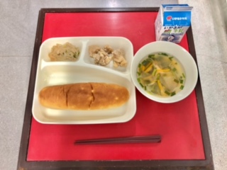 9月22日(水)の献立は「おさつパン・牛乳・鶏肉のからあげ・とうがんの中華スープ・切干しだいこんのごま辛みづけ」でした。