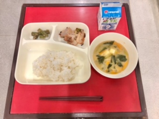 9月24日(金)の献立は「ごはん・牛乳・豚肉の甘辛焼き・みそ汁・オクラのおかかいため」でした。/The school lunch menu for Friday, September, 24th was "Steamed Rice, Milk, Sweet and Spicy Grilled Pork, Miso Soup, Stir-Fried Okra with Dried Bonito".