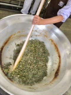 下段の写真は、オクラにかつおぶしを加えて仕上げている様子です。