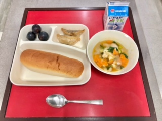 9月28日(火)の献立は「黒糖パン・牛乳・あげぎょうざ・中華煮・ぶどう(巨峰)」でした。