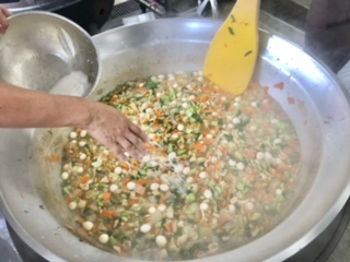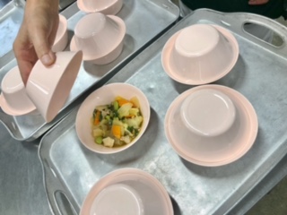 下段の写真は、個別対応用献立の中華煮です。ピンク色のお椀で見分けがつきやすくなっています。