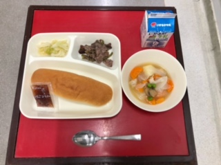 9月30日(木)の献立は「コッペパン(いちごジャム)・牛乳・牛肉の香味焼き・スープ煮・サワーキャベツ」でした。