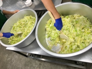 下段の写真は、サワーキャベツにドレッシングをかけて和えている様子です。