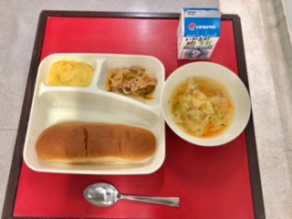 10月1日(金)の献立は「黒糖パン・牛乳・豚肉と野菜のケチャップソテー・スープ・スイートポテト」でした。/The school lunch menu for Friday, October, 1st was "Brown Sugar Bread, Milk, Ketchup-Sauted Pork and Vegetables, Soup, Sweet Potatoes".