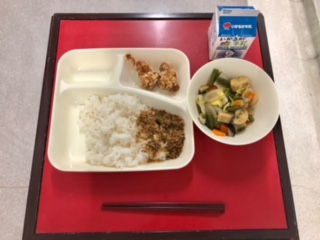 10月4日(月)の献立は「ごはん・牛乳・鶏肉のたつたあげ・一口がんもと野菜の煮もの・おかかなっ葉」でした。/The school lunch menu for Monday, October, 4th was "Steamed Rice, Milk, Japanese Deep-Fried Chicken, Boiled Bite-Sized Fried Tofu with Vegetables, Stir-Fry Dried Bonito Flakes and Radish Leaves".