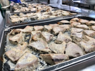 かつおのマリネ焼きは、塩、こしょう、ノンエッグドレッシングで下味を付けたかつおを、焼き物機で蒸し焼きにした焼き魚でした。この料理は鶏卵を使用していないマヨネーズ味の調味料「ノンエッグドレッシング」で調理されていて、卵アレルギーの児童でも食べられるように配慮されていました。