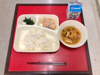 10月13日(水)の献立は「ごはん・鶏肉のゆず塩焼き・ソーキ汁・ほうれんそうのおひたし」でした。