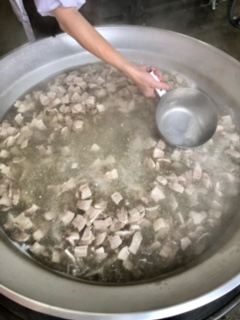 中段の写真は、ソーキ汁の豚バラ肉を下茹でしている様子です。ソーキ汁は、けずりぶしで取っただしに、脂を落とした豚バラ肉、切りこんぶ、だいこん、にんじん、えのきたけを加えて煮、みりん、塩、しょうゆで味付けして仕上げた沖縄の汁ものでした。