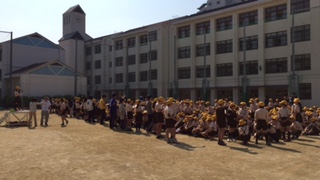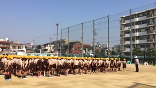 4月27日(月)始業式からずっと雨の日が多く、月曜日朝の全校朝会も続けて講堂で行っていました。今日は朝から良いお天気だったので、初めて運動場で全校朝会ができました!