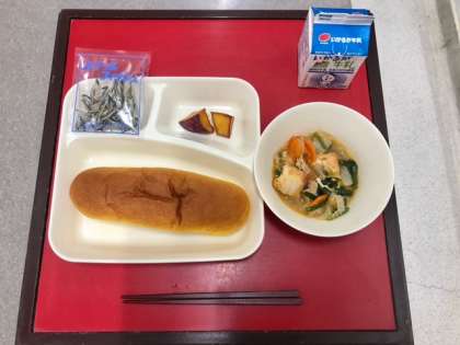 10月14日(木)の献立は「パンプキンパン・牛乳・豚肉といかの中華煮・大学いも・ミニフィッシュ」でした。/The school lunch menu for Thursday, October, 14th was "Pumpkin Bread, Milk, Chinese-Style Boiled Pork and Squid, Candied Sweet Potato, Dried Mini Sardines".