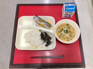 10月15日(金)の献立は「ごはん・牛乳・さんまのみぞれかけ・みそ汁・牛ひじきそぼろ」でした。/The school lunch menu for Friday, October, 15th was "Steamed Rice, Milk, Grilled Pacific Saury with Grated Daikon Radish, Miso Soup, Beef Soboro with Hijiki Seaweed".