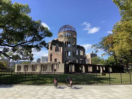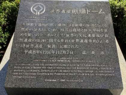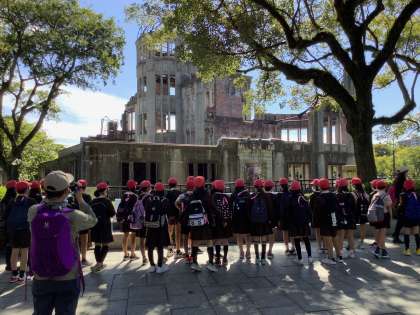 平和記念公園での活動を始める前に、原爆ドームのことについて話を聞いています。