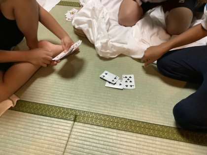 順番にお風呂に入っていますが、待っている子たちは、話をしたり、トランプをしたりしています。