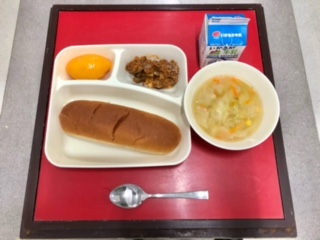 10月26日(火)の献立は「黒糖パン・牛乳・なすのミートグラタン・鶏肉と野菜のスープ・黄桃(缶)」でした。