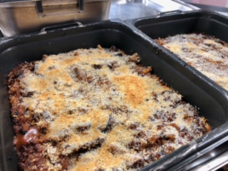 なすのミートグラタンは、具材にひき肉、なす、たまねぎ、マカロニを使用し、ケチャップ、ウスターソース等で味付けし、焼き物機で焼き上げました。