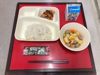 10月27日(水)の献立は「ごはん・牛乳・みそカツ・じゃがいもと野菜の煮もの・焼きのり」でした。