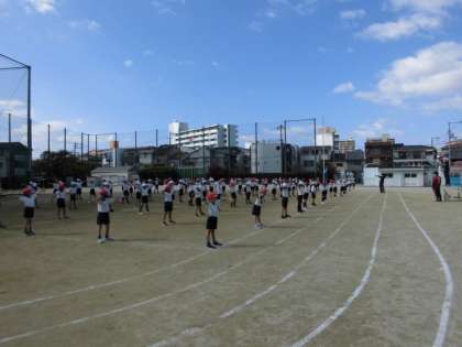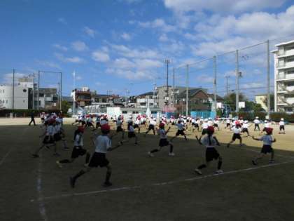 今日の写真は、2年生の団体演技の練習風景です。子どもたちは教わったことをすぐに覚えるので、最初から最後まで通しての練習を進めています。