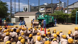 5月11日(月)4年生は社会科でごみについての学習をしています。今日は環境局からパッカー車が学校に来て、ごみの分別の仕方や環境についてのお話をしてくださいました。子どもたちは自分の手でパッカー車にごみを入れる体験もして、環境についていちだんと関心を深めたようです。家でも自分でごみの分別ができるようになるといいですね。
