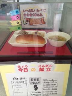本日の献立は「豚肉と野菜のいためもの・すまし汁・金時豆のおこわ・パン・牛乳」でした。