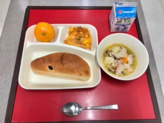 11月10日(水)の献立は「レーズンパン・牛乳・豚肉と野菜のスープ煮・変わりピザ・みかん」でした。