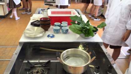 5月14日(木)5年生になって家庭科の学習が始まり、今週は各組で初めての調理実習をしました。献立はホウレンソウをゆがいておひたしにするのと、緑茶です。簡単な内容のようですが、初めて包丁を持つ子もいて、洗う、ゆがく、切る、片付ける等の作業を班で手分けしながら楽しく実習しました。お茶もおいしく茶葉の量や、お湯の温度を考えておいしくいれました。子どもたちは「ドキドキしたけどうまくできてよかったです。」「家で飲むよりおいしかったです。」と言っていました。家でも家族の人に、おいしいお茶をいれてあげてほしいですね。
