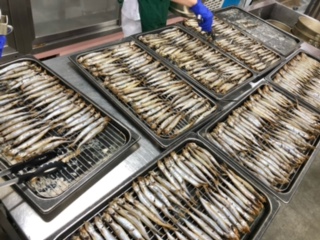 下段の写真は、焼き上がったししゃもを配缶している様子です。