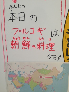 本日の献立は「プルコギ・とうふのスープ・甘酢あえ・米飯・牛乳」でした。