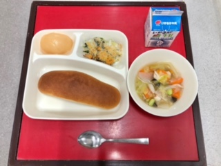 11月25日(木)の献立は「黒糖パン・牛乳・スープ煮・ほうれんそうのグラタン・白桃(缶)」でした。