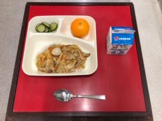 11月26日(金)の献立は「中華丼・牛乳・きゅうりの中華あえ・みかん」でした。
