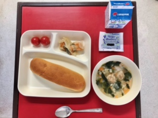 12月6日(月)の献立は「コッペパン(ブルーベリージャム)・牛乳・さけのマリネ・肉だんごと麦のスープ・プチトマト」でした。/The school lunch menu for Monday, December, 6th was "Bread Roll with Blueberry Jam, Milk, Marinated Salmon, Meatball and Wheat Soup, Cherry Tomatoes".