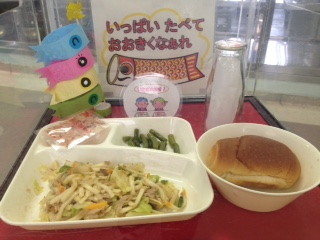 本日の給食は「焼うどん・三度豆のごまあえ・パン・牛乳」でした。