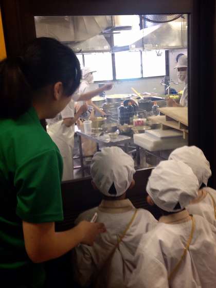 今日は学校探検で一年生が給食室に見学に来ました。児童たちは普段見ることが少ない調理をしている様子や、大きな釜を見て驚いた様子でした!