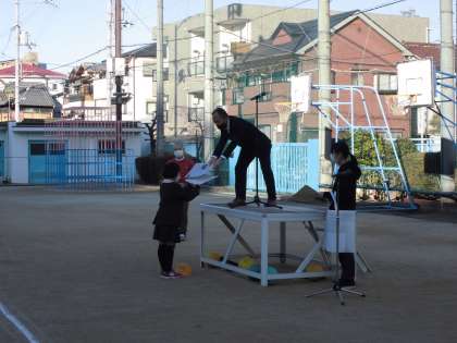 1枚目の写真は、表彰の様子です。3年生の児童が、大阪市青少年読書感想文コンクールにおいて「大阪市学校図書館協議会長賞」をいただきましたので、みんなの前で学校長より賞状と副賞を授与してもらっている様子です。