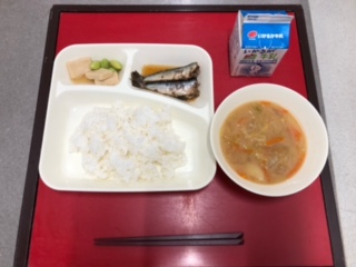 12月15日(水)の献立は「ごはん・牛乳・いわしのしょうが煮・みそ汁・高野どうふの煮もの」でした。