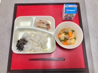 12月21日(火)の献立は「ごはん・牛乳・鶏肉のゆず塩焼き・含め煮・魚ひじきそぼろ」でした。