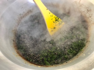 下段の写真は、魚ひじきそぼろにしそを加えて仕上げている様子です。