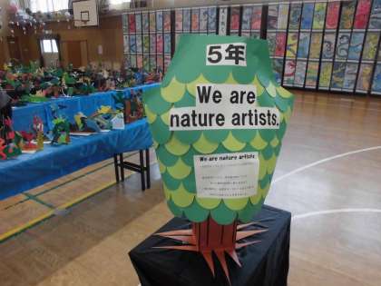 5年生は「自然」をテーマに「We are nature artists.」の作品作りに取り組みました。電動糸のこぎりを使っての作業は、初めはおそるおそる動かしていましたが、次第にうまく操作することができるようになりました。