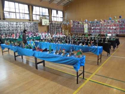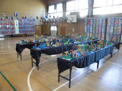1枚の板からパーツを切り出し、丁寧にみがき上げ、着色してしあげました。色の選び方や色のぬり方、パーツの組み合わせ方など、児童一人ひとりの個性が表現されていて、とても見応えのある作品になったと思います。(5年担任より)