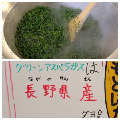 グリーンアスパラガスは長野県産の生の物を使用し,下ゆでしたあとさっと炒めて食感を残しました。オリーブ油と塩コショウのシンプルな味付けでした。