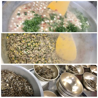 ぞう煮は、かつお節で取っただしに、鶏肉、金時にんじん、さといも、おもち等を加えて煮、最後に合わせみそ、みつばを加えて仕上げた汁ものでした。