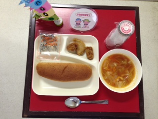 本日の給食は「一口トンカツ・フレッシュトマトのスープ・アーモンドフィッシュ・パン・牛乳」でした。