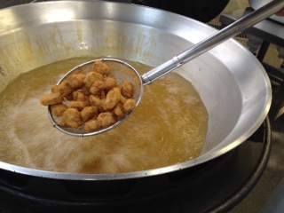 一口トンカツは給食室でパン粉を付けてから揚げた「手作りのトンカツ」です。
