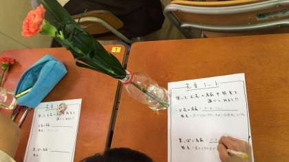 5月27日(水)6年生がキャリア教育の一環として、なにわ花いちばの人からお話を聞くと共に、お花を活ける体験をしました。お話は「みなさんはどんなときに花を贈ったり、贈られたり、見かけたりしますか?」という質問に始まり、子どもたちが「母の日や、結婚式などです。」と答えると、「そうですね。その他にもお葬式や発表会、誕生日会等でもよく見ますね。」ということで、ブロッサムにある「鶴見花卉(かき)市場」のお仕事についてお話されました。