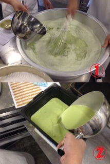 「上新粉・抹茶・砂糖」を混ぜ合わせた後、少しずつ水でといていきます。写真中央1