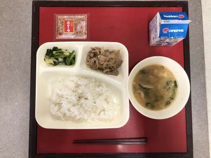 3月15日(火)の献立は「ごはん・牛乳・豚肉のしょうが焼き・さつまいものみそ汁・なのはなのおひたし」でした。