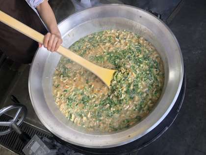 写真は、本日の給食の見本と、さつまいものみそ汁の調理の様子です。