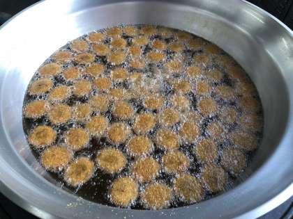 写真は、本日の給食の見本と、チキンレバーカツの調理の様子です。
