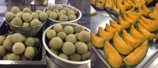 クインシーメロンは熊本県産のものが使われました。カットした後、切り込みを入れ種を取り配缶しました。