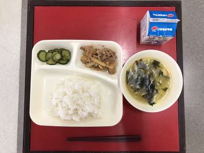 3月17日(木)の献立は「ごはん・牛乳・豚肉のコチジャンいため・鶏肉とはるさめのスープ・きゅうりのナムル風」でした。